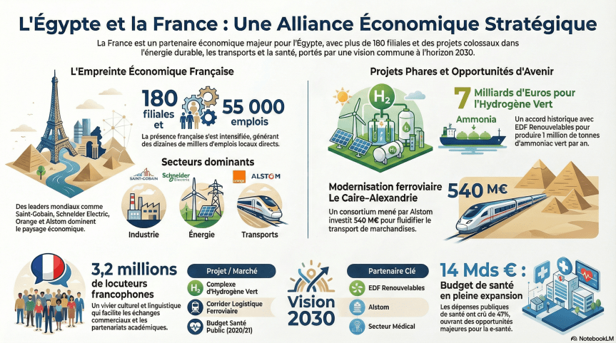 Aujourd’hui, l’Égypte représente l’un des marchés les plus dynamiques de la région méditerranéenne et africaine, avec plus d’une centaine d’entreprises françaises actives dans des secteurs clés tels que le transport, l’énergie, la construction, la distribution, la santé et les services.