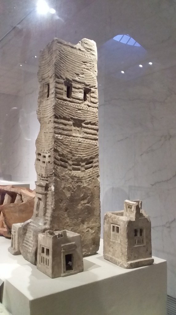Au chapitre des objets insolites on peut citer une prothèse d’orteil réalisée sur mesure, (hélas sans aucune indication du lieu de la trouvaille ni de l’époque car il manque encore beaucoup de cartels dans les vitrines) mais une tablette est posée dans l’angle de la vitrine et montre, à l’aide d’une animation en 3D, comment elle était utilisée. Un modèle de tour de briques d’époque romaine réalisé en pierre, montre un système de construction astucieux en plaçant des briques formant des vagues pour donner de la souplesse au bâtiment.