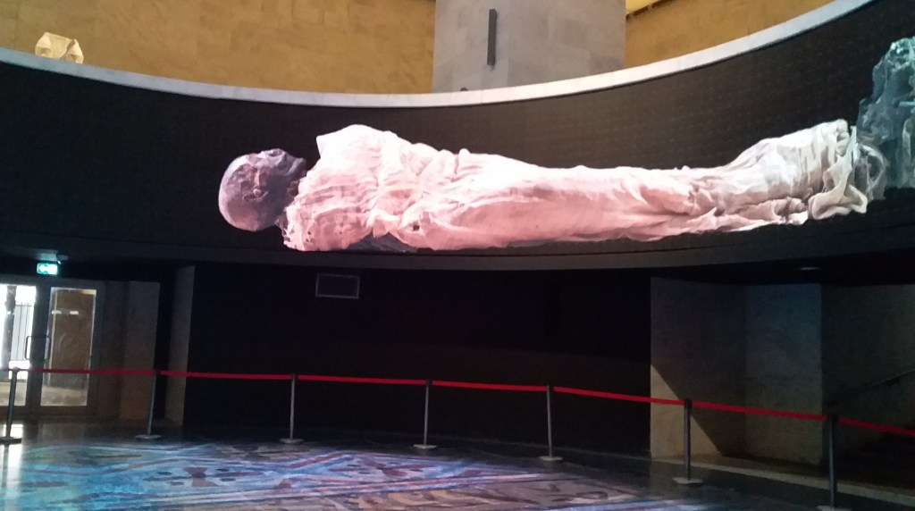 En pénétrant dans le musée, une impression de vide se fait tout de suite sentir dans l’entrée car il n’y a strictement RIEN ! Un long et large couloir lumineux, vous attire alors comme pour vous dire : « – Oui oui avancez, c’est bien par là ! » Alors vous entrez dans ce « corridor du temps » et vous vous retrouvez devant un choix cornélien : descendre un escalier mystérieux qui traverse une rotonde où défilent les momies royales sur un écran circulaire ou bien contourner ce puits de lumière tamisée et atteindre enfin l’immense salle des trésors retrouvés ?