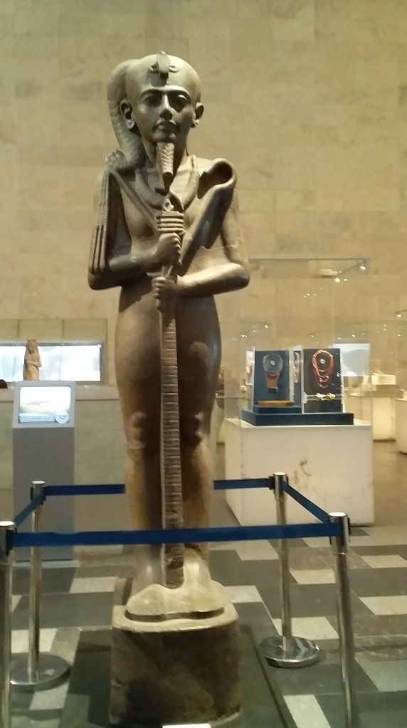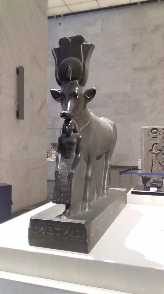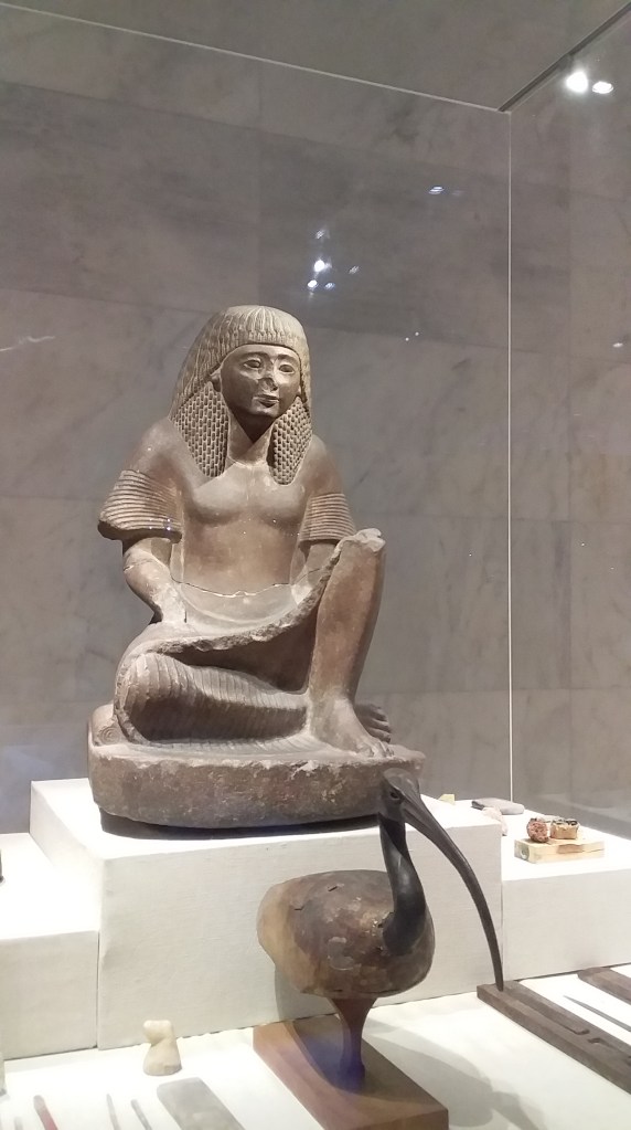 Pour rejoindre le monde des vivants, vous suivrez un escalier modeste qui vous propulsera à l’époque romaine dans l’immense salle d’exposition très lumineuse. Organisée à la fois chronologiquement (de la Préhistoire au XXème siècle) et par thème, (le Nil, habitat, soins du corps, temps, religion) elle présente une sélection subtile d’objets représentatifs de chaque item. Ce qui est appréciable c’est que, contrairement à ce qui devient désormais une habitude dans beaucoup de musées que de mettre les œuvres sous vitrines, des sculptures, de bois, de bronze comme de pierre, et autres pièces, sont exposées à la vue directe du public simplement entourées d’un ruban bleu pour maintenir les visiteurs à distance. Et vous retrouverez avec joie certaines œuvres du musée de la Place Tahrir bien mises en valeur ici comme la belle statue du dieu lune Khonsou sous les traits de Toutankhamon, celle du scribe Hapi (de Karnak) ou encore celle en schiste de la déesse Hathor protégeant le pharaon Psammétique.