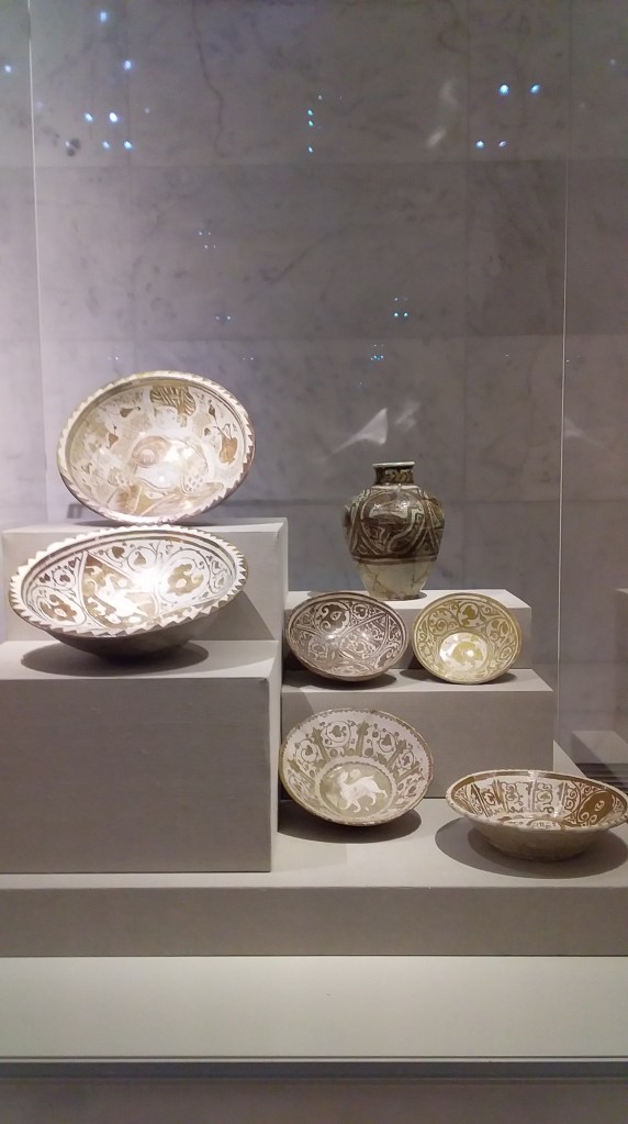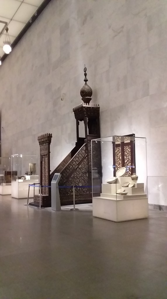 L’époque islamique n’est pas en reste car on retrouve de belles pièces de céramique, issues du musée de la rue Port-Saïd comme le plat circulaire au Joueur de Luth d’époque fatimide (très particulier avec son point turquoise sur le visage), un superbe minbar mamelouk et une intelligente exposition de maquette de certains immeubles du centre-ville du début du XXème siècle avec leur architecte ou leur commanditaire comme le célèbre Pacha Talaat Harb, créateur de la Banque Misr, première banque 100% égyptienne, actionnaires comme employés.
