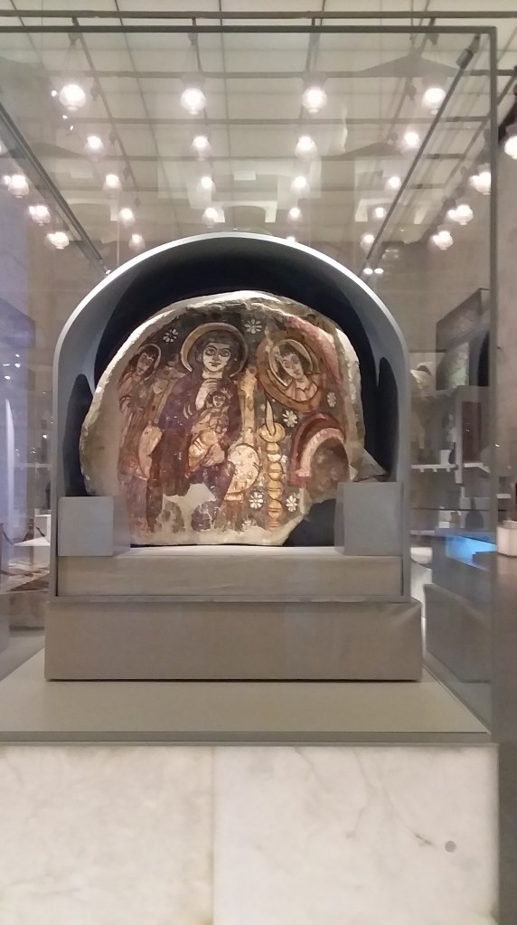 De fragiles pièces de tissu copte sont également exposées ainsi qu’une fresque provenant d’un plafond de chapelle dont le décor représente une vierge à l’enfant entourée de saints.